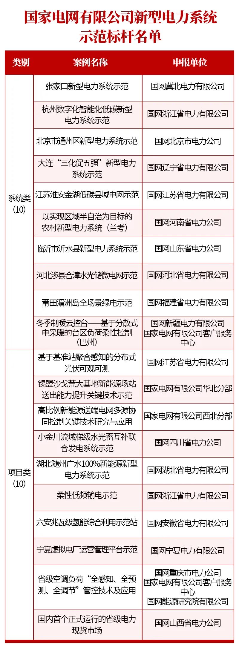 近日,国家电网有限公司印发通知,发布新型电力系统示范标杆名单和典型案例集,包括系统类示范标杆10项、项目类示范标杆10项。